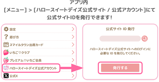 ※アプリ内[メニュー] > [ハロースイートデイズ公式サイト / 公式アカウント] > [公式サイトID発行] > [発行する]